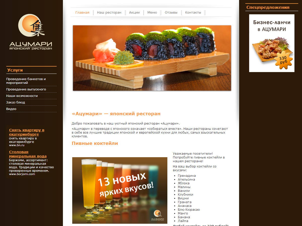 В итоге у нас получился лаконичный сайт японского ресторана с полноценным меню, фотографиями ресторана, в который мы впоследствии добавили гостевую книгу для отзывов посетителей.