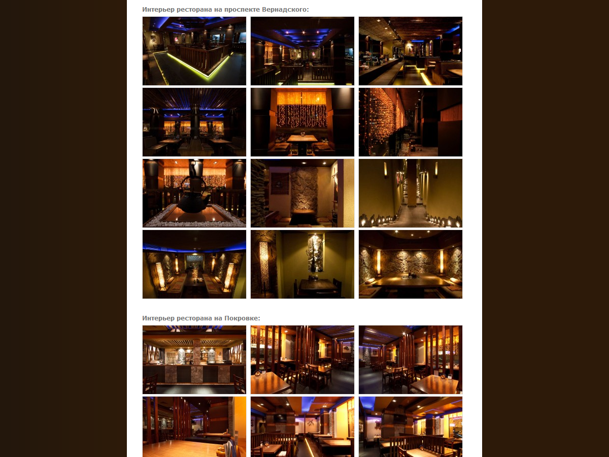 Далее мы занялись графическим оформлением сайта и самого меню. Имеющиеся на тот момент фотографии блюд у ресторана были очень плохого качества -- посетителей сайта отталкивал внешний вид блюда. Мы предложили ресторану наши фотоуслуги и полностью пересняли почти все меню. Кроме того, мы сделали фотографии интерьеры и 3D-панорамы. Нашими фотографиями был украшен в том числе и сам интерьер ресторана в виде фотокартин.