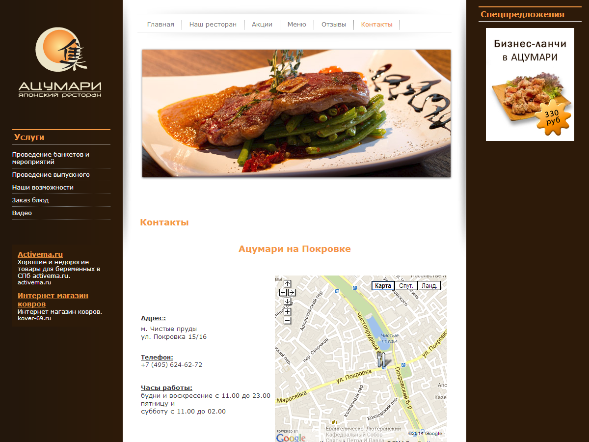 Ацумари - японский ресторан, нуждающийся в простом и красивом веб-сайте для размещения информации о блюдах и мероприятиях. Ресторану требовалось обновление имеющегося сайта и наполнение его информацией.